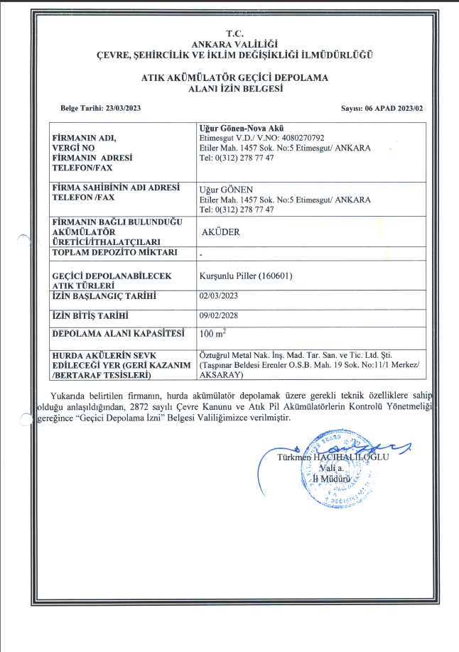 ATIK AKÜMÜLATÖR GEÇİCİ DEPOLAMA ALANI İZİN BELGESİ